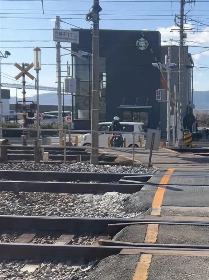 图2:日本媒体报道截图(受访者供图)等待的过程中,她发现有提示这里的红绿灯是要自己按的,她们就按了,但不是一按就绿,需要等一会儿。“在等待绿灯的过程中,在我们身后三条轨道远的距离,驶过一辆电车。”林女士说,后来栏杆抬起来了,等绿灯亮了之后,她们就走了。可能有人会问,为什么当时不钻出栏杆呢?林女士解释说:“我当时也觉得所处的位置有危险,但是对面马路又是红灯,车子很多,而且不确定是不是能够钻栏杆过去,而且觉得就算钻过去,外面也挺危险。图3可以看到,摩托车就是在外面,但是正面直接开过小车,离得很近。所以她们还是站在原地等待。”