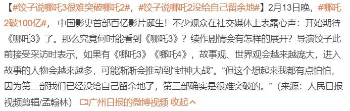 所以 中国影史首部百亿影片诞生后,不少观众在社交媒体上表露心声:开始期待《哪吒3》了。那么究竟何时能看到《哪吒3》?续作剧情会有怎样的展开?导演饺子导演在庆祝丰收的同时,压力也巨大,第三部作品的面世时间一改又改,还是未知数。